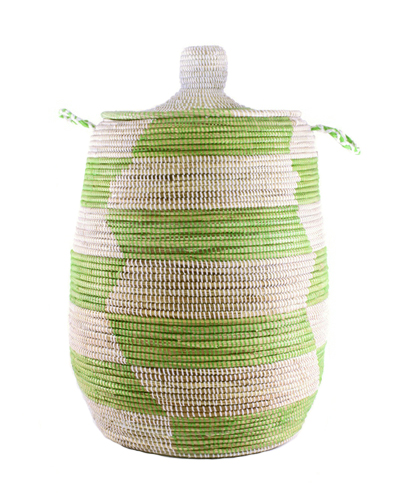 African laundry hampers also serve well as storage baskets for blankets and linens in the bedroom. Each wolof basket is woven by a Senegalese woman from recycled plastic strips used in the production of prayer mats and a natural grass called njodax. The baskets feature a snug-fitting lid, braided handles and a classic woven pattern. A beautiful and functional way to bring modern African style to your home!