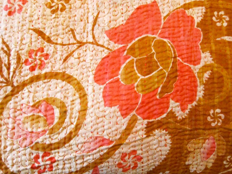 This Vintage Kantha Throw features coordinating coral blooms with golden leaf and swirl accents on either side.