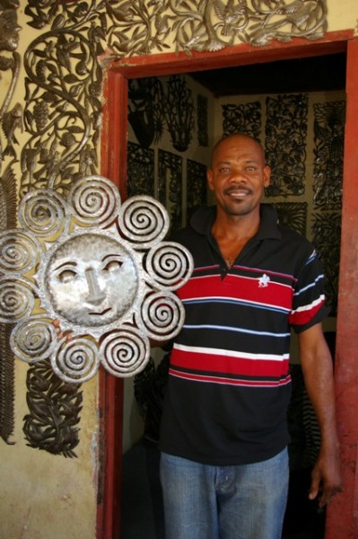 This Spiral Sun is sure to bring joy to your home, just as your purchase brings joy to the artist, Brutal Michel's family. Each piece of art is cut and shaped by hand from a 55-gallon recycled metal drum. The finished design is coated with a protective finish so that it can be hung indoors or outdoors.
